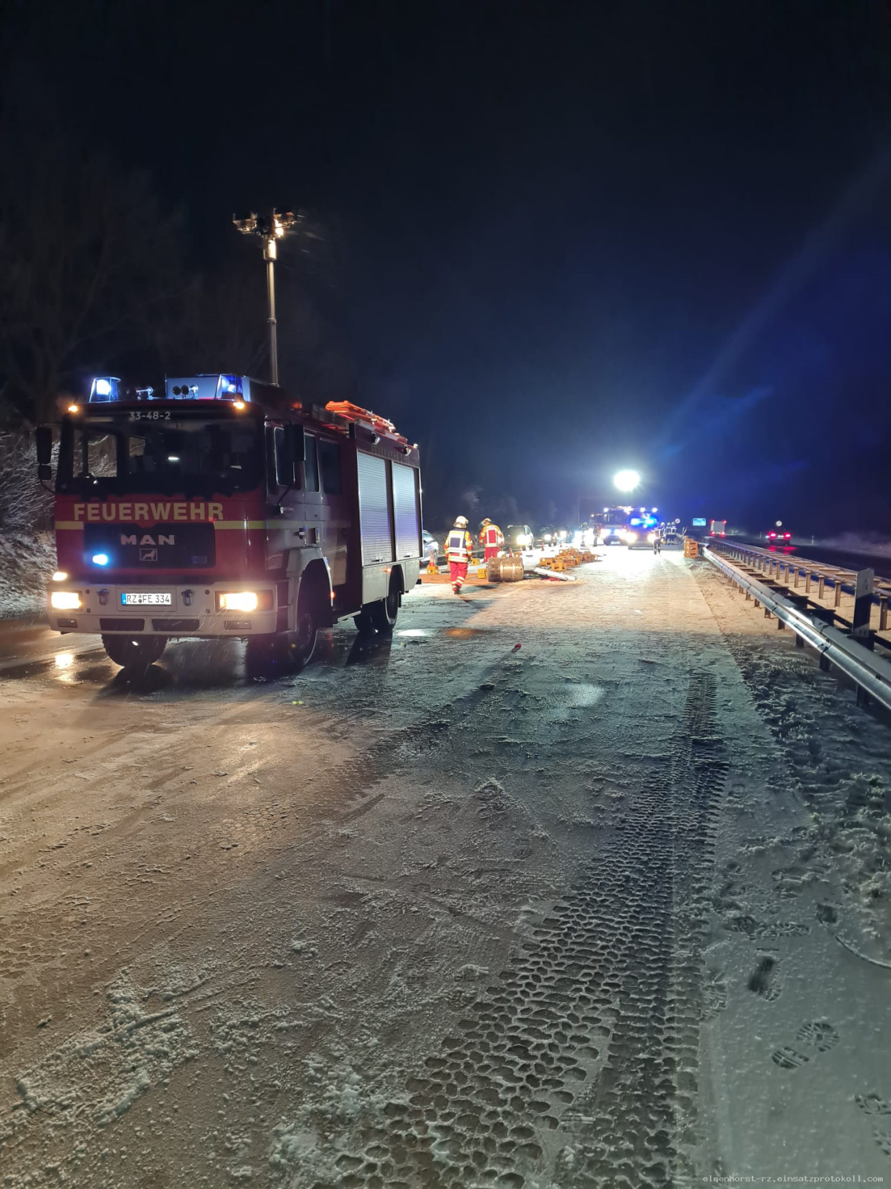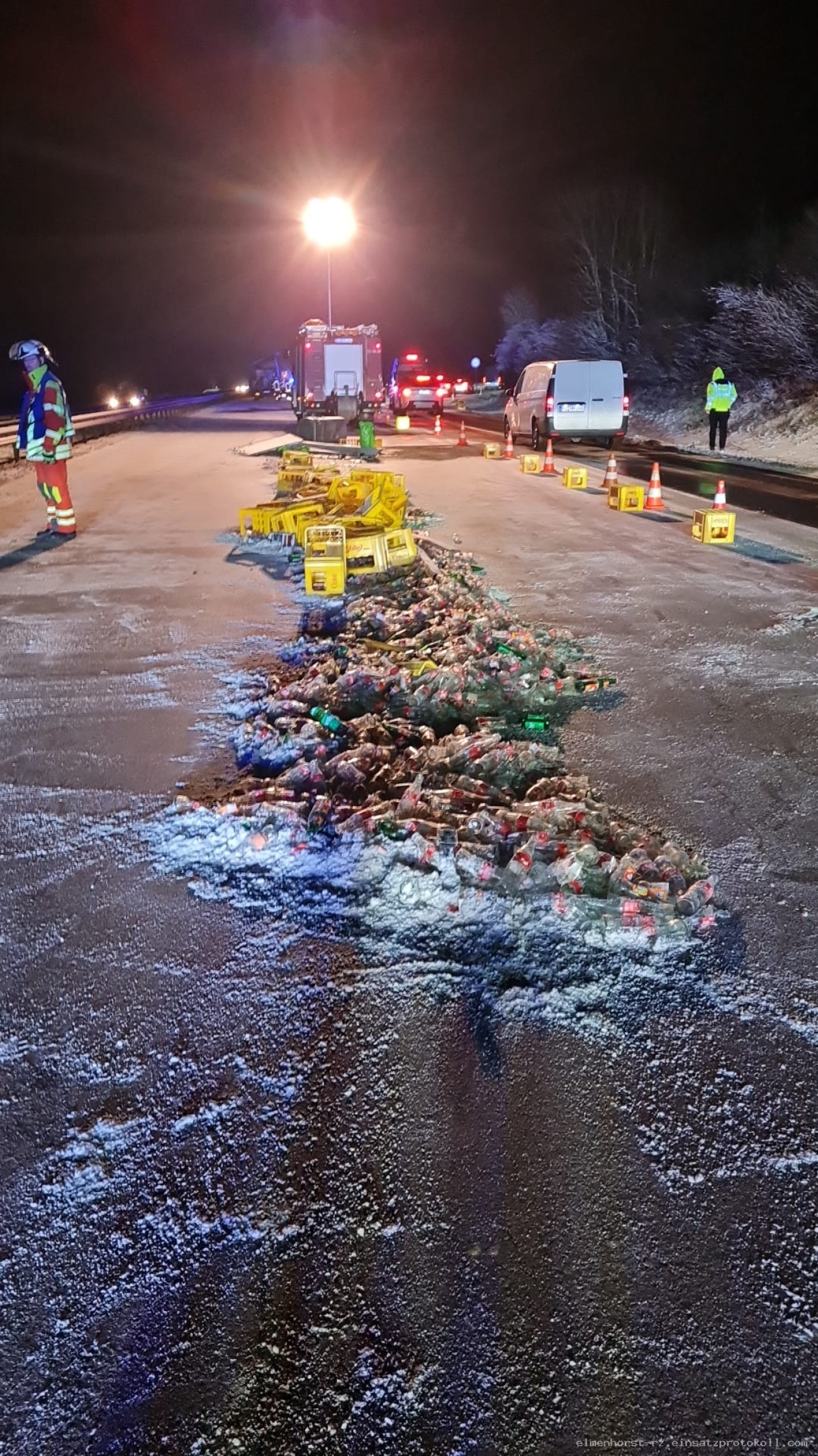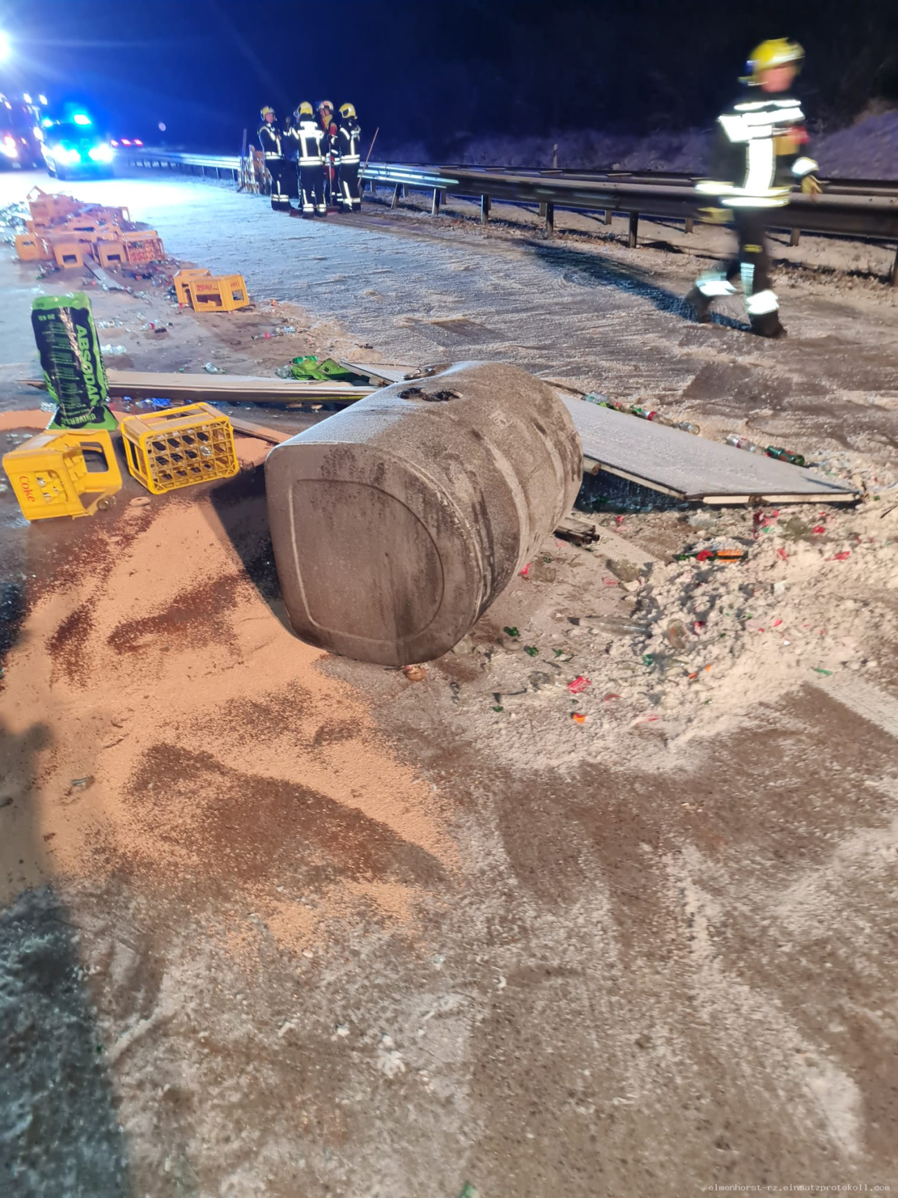 Glätteunfall: Kollision zweier LKW. Ladung auf der Fahrbahn verteilt, Dieseltank abgerissen. Keine Verletzten.